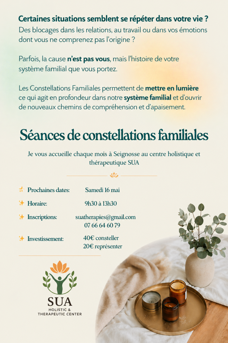 “Las constelaciones familiares son un método terapéutico especialmente indicado para ampliar la comprensión de las relaciones que se dan en el seno de una familia, así como para tomar consciencia de determinadas dinámicas transgereneracionales que se repiten en una familia a lo largo del tiempo”